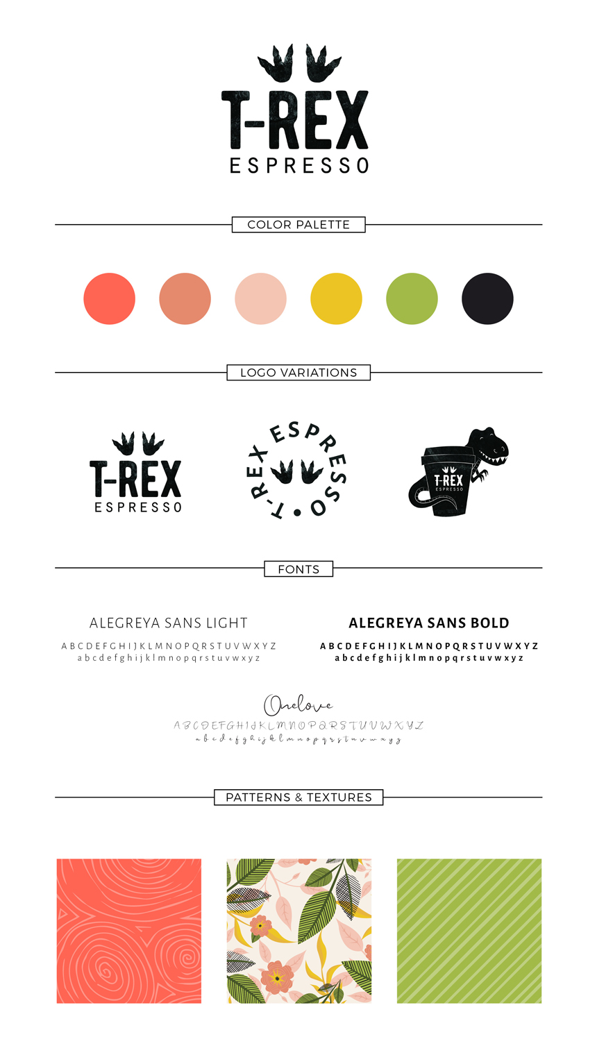 T-Rex Espresso is a proposed coffee company that will be located in Whatcom County, Washington if plans are carried through for the business. The client, Tayler Robison, chose the name for the company because it reflects a family name (Rex) that has been passed down to the generations of her family. Her vision for the company is to create a local coffee stand that's a go-to for unique and delicious coffee beverages and treats. Plans have been put on hold for the company for the time being, but I completed a logo and brand identity design in hopes that they will open in the future. Our vision for the company's brand identity was to create a look that's exotic, modern, and feminine. I created a brand board and mockups that demonstrate how the brand identity would be used in different formats.